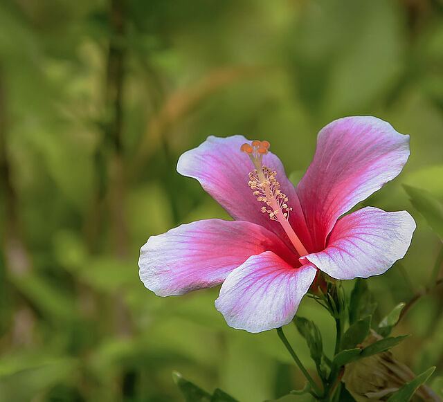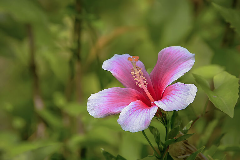 - l'ibisco è molto conosciuto per i suoi grandi fiori elaborati a forma di tromba. Questi fiori hanno cinque o più petali e il loro colore varia dal bianco al rosa, rosso, arancione, pesca, giallo e viola;