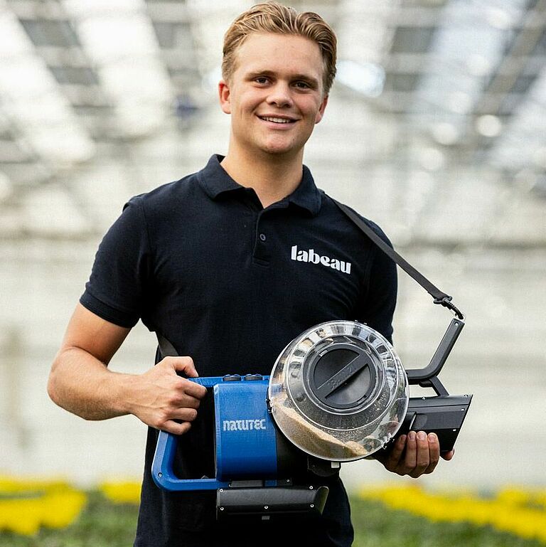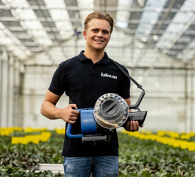 Grazie all'innovativo sistema a doppio condotto, Airobreez disperde i nemici naturali sia da zero a un metro che in un raggio di quattro metri, distinguendosi così sul mercato. Anche il consulente Koppert Wim van der Meer, che visita regolarmente Labeau, ha notato il miglioramento della portata e dell'efficacia: "Con il suo flusso d'aria delicato, l'Airobreez disperde in modo sicuro i nemici naturali sulle colture e, con oltre il 98% che raggiunge il bersaglio indenne, i risultati sono notevoli!".