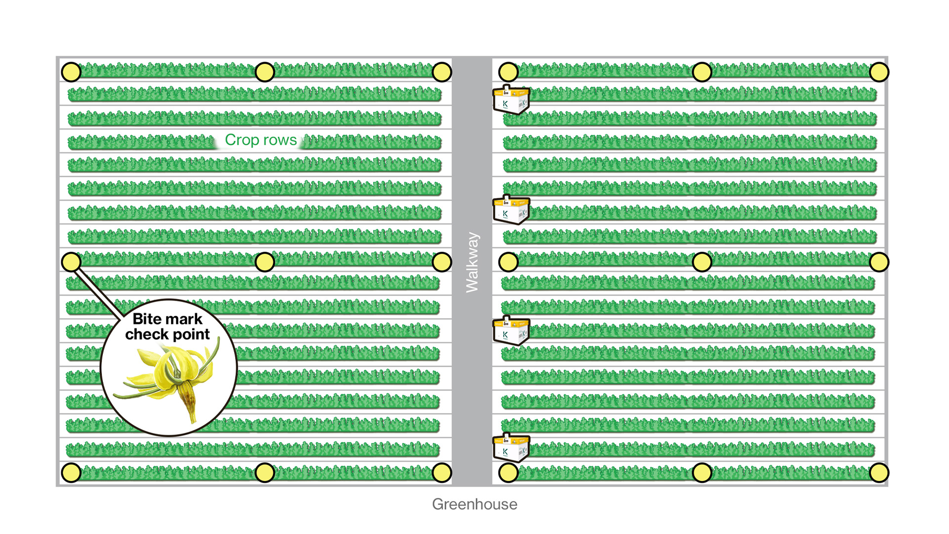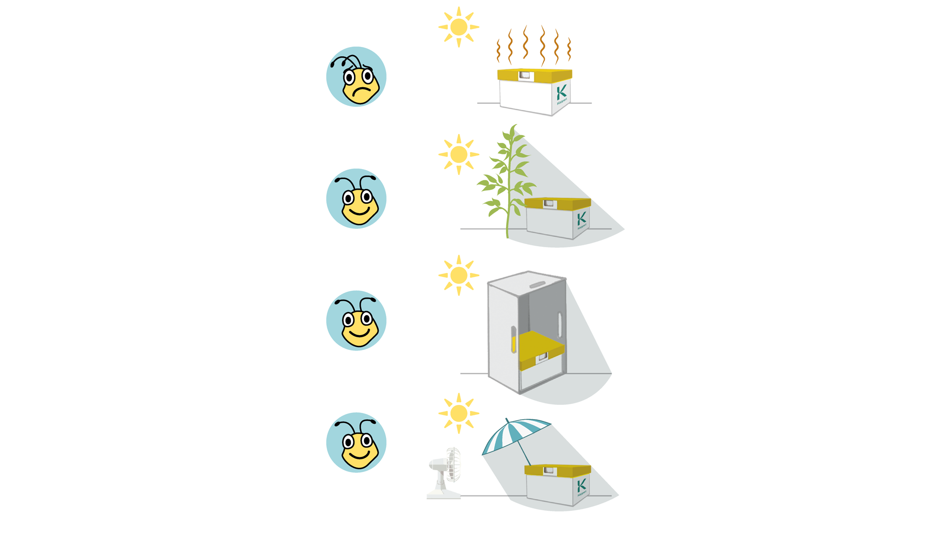 In inverno, scegliete un luogo in cui le arnie ricevano la luce del sole nelle prime ore del giorno, in genere sul lato nord. Se necessario, le arnie possono essere posizionate più in alto all'interno della coltura, ad un'altezza minima di 1,4 metri dal suolo, in particolare nelle zone a coltura fitta. Nei giorni più bui dell'inverno, si consiglia di posizionare le arnie sopra la coltura, vicino al tetto della serra. In questo modo i bombi ricevono la massima luce diurna, favorendo il loro orientamento. Per evitare il surriscaldamento, assicuratevi che le arnie non siano posizionate troppo vicine a lampade che generano calore. Inoltre, proteggete i bombi dalla luce diretta del sole nel pomeriggio utilizzando schermi posti sopra le arnie. In periodi di basse temperature, proteggete i bombi dal freddo.