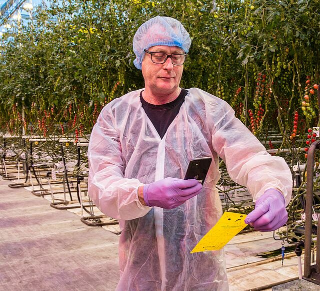Anche se continua a tenere d'occhio il livello di uova di mosca bianca deposte, Jan dice che il monitoraggio della mosca bianca non è più necessario. Fotografiamo le trappole appiccicose e vediamo subito come si sviluppa il livello di infestazione".