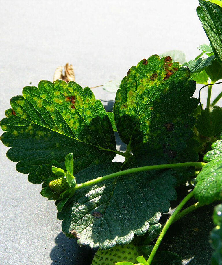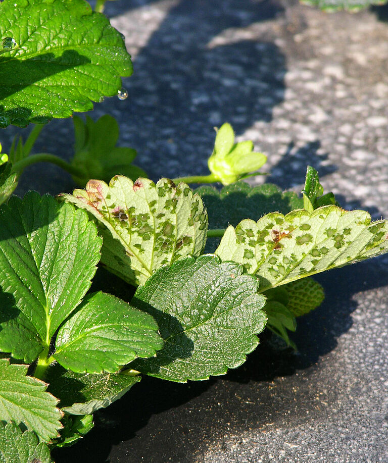 Xanthomonas fragariae inizialmente provoca piccole lesioni impregnate d'acqua nella parte inferiore della foglia, che si estendono fino ai punti angolari, spesso limitati da venuzze. La caratteristica distintiva è il modo in cui le lesioni compaiono quando si utilizzano fonti luminose diverse: quando si utilizza la luce riflessa, le lesioni appaiono di colore verde scuro, mentre quando viene utilizzata la luce trasmessa, esse appaiono traslucide. In condizioni umide, sul lato inferiore della foglia si forma un essudato batterico viscoso. Una volta asciutto, questo essudato si trasforma in un film bianco. Le lesioni si possono fondere mentre crescono e in seguito diventano visibili anche sul lato superiore della foglia come punti irregolari che assumono in un primo momento una colorazione marrone-rossastra per poi diventare necrotici. I sintomi fogliari sono i più importanti. Tuttavia, possono essere infettati anche tutti i tipi di tessuto vascolare della corona, dando vita a un aspetto simile a quello di un'infezione da Phytophthora fragariae.