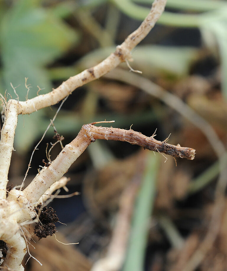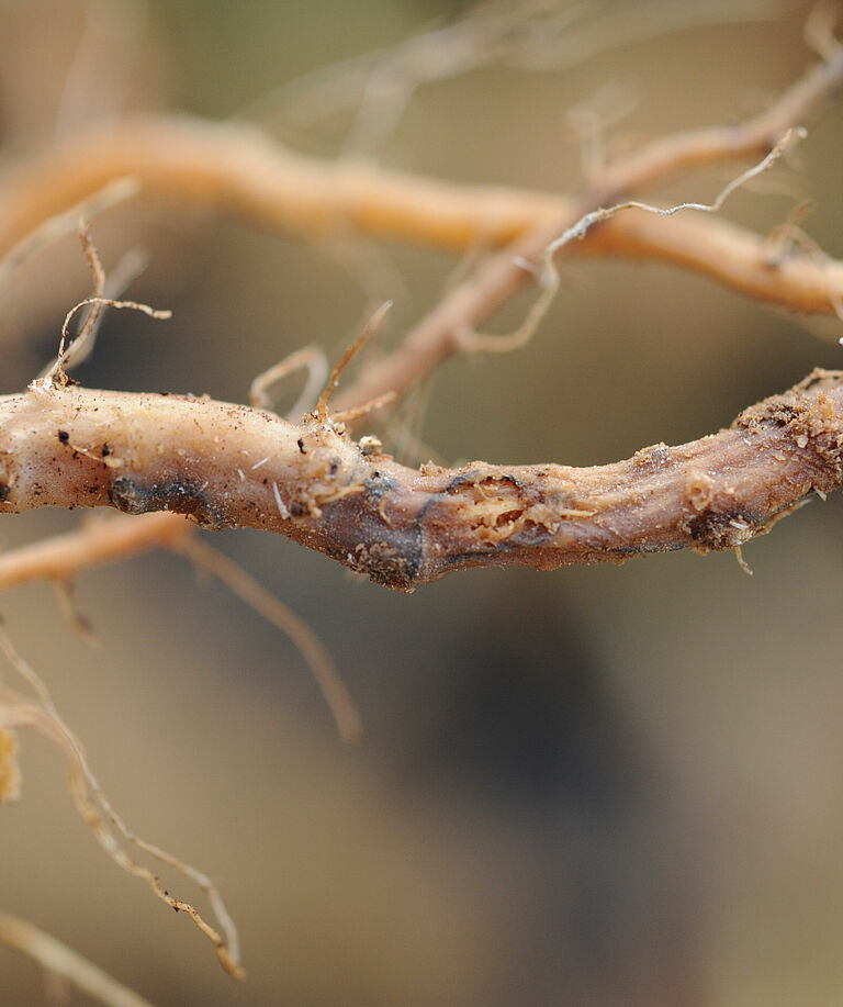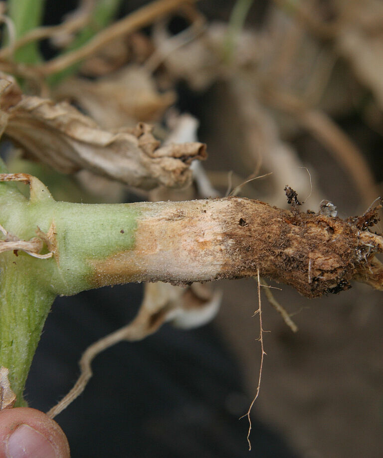 La malattia è di solito limitata a poche radici ma nei casi più gravi tutte le radici possono essere infette. Nella fase finale della malattia, rimane solo il tessuto vascolare perché la corteccia (strato esterno) è marcita. L'infezione nelle prime fasi della coltura determina una crescita stentata della pianta e foglie più piccole dal colore verde intenso. In questo stadio, una grave infezione può uccidere le piante. In caso di infezione meno grave, le piante possono appassire in una fase tardiva della coltura. Tuttavia, quando l'approvvigionamento idrico è in qualche modo limitato durante periodi precoci caratterizzati da un’elevata evaporazione, l’ avvizzimento può verificarsi prima. Nelle piante avvizzite, la corona sembra essere impregnata d'acqua, passando da un colore marrone chiaro al nero con essudazione di spore color ambra. Nelle prime fasi dell'avvizzimento, è difficile effettuare una distinzione dalle altre malattie da appassimento.