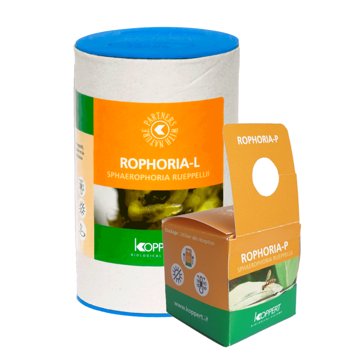 - Rophoria-P: una confezione di cartone da appendere alla coltura contenente 100 pupe del sirfide. Dalle pupe nasceranno gli adulti che, una volta insediatisi sulla coltura, andranno a deporre le uova in prossimità dei primi focolai. Rophoria-P viene utilizzato con un approccio preventivo, rilasciandolo sulla coltura da quando osserviamo i primi fiori.