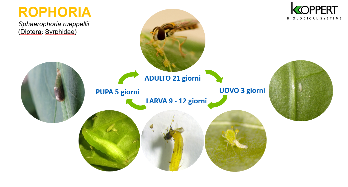 Tra i vantaggi di Rophoria c'è la grande adattabilità. "Sphaerophoria rueppellii è attiva in presenza sia di alte che di basse di temperature. Le larve e gli adulti sono attivi da 5°C a 40°C (l’ottimo di sviluppo fra i 15 e i 35°C) - illustra il general manager di Koppert - Questo sirfide inoltre non entra in diapausa quando le giornate si accorciano ed è resistente a bassi livelli di umidità".