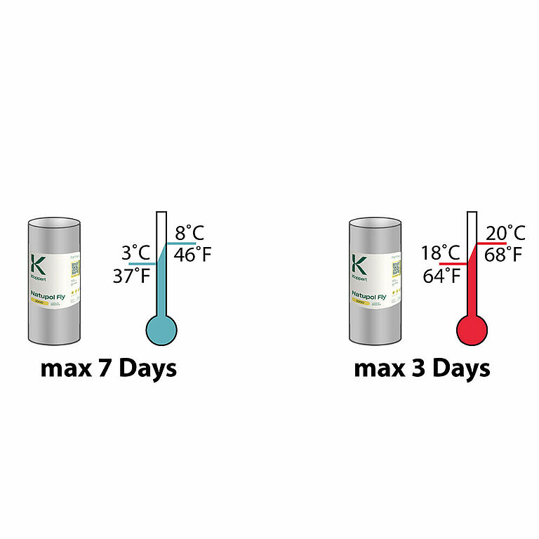 Non rilasciare Natupol Fly se la temperatura è inferiore a 15 °C. Il risultato sarà imprevedibile e richiederà spesso più di una settimana. Nel caso in cui si debba usare Natupol Fly a temperature inferiori ai 15 °C, si consiglia di farle maturare prima in un ambiente caldo. Rilasciare Natupol Fly dopo la fuoriuscita delle prime mosche completamente sviluppate.