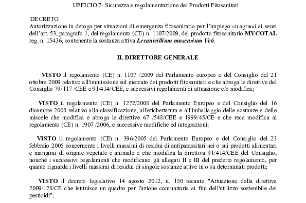 Vista la situazione emergenziale, il Ministero della Salute ha autorizzato l’estensione di impiego di Mycotal (Lecanicillium muscarium Ve6, ora Akanthomyces muscarius Ve6) contro gli aleurodidi negli agrumi.