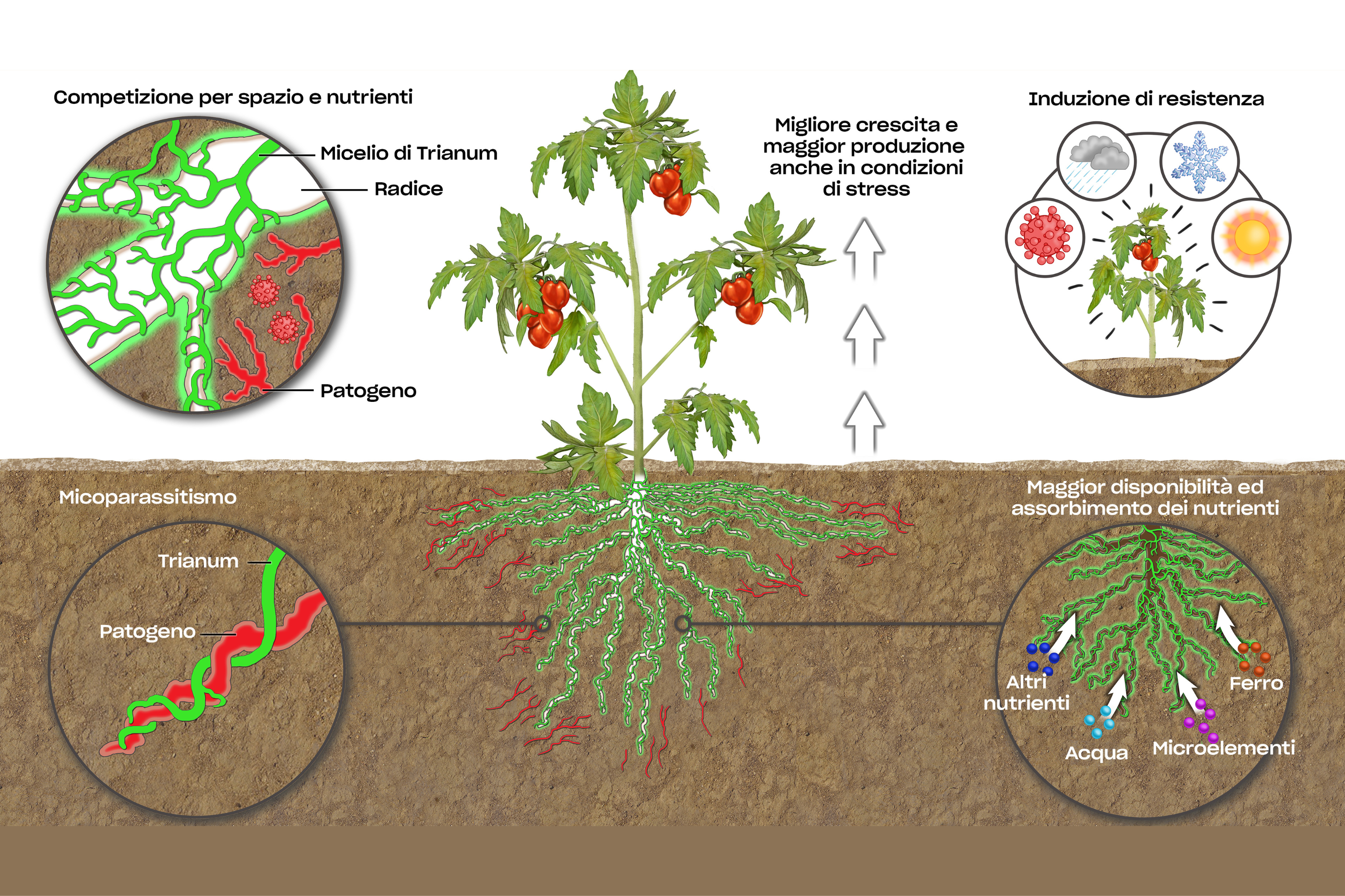 Nella rizosfera avviene anche una serrata competizione per i nutrienti. Diversi funghi patogeni si nutrono delle sostanze secrete dalle radici per innescare determinati processi infettivi, Trianum riesce però ad utilizzare in maniera più rapida ed efficiente queste sostanze lasciando i patogeni privi di nutrimento. Vi è inoltre il fenomeno del micoparassitismo: il Trichoderma harzianum T22, infatti, è in grado di aggredire direttamente per via enzimatica le membrane cellulari dei funghi patogeni, predandoli ed impedendone la diffusione. Oltre a ciò, Trianum si lega alla radice della pianta entrando in simbiosi con essa. Così facondo la stimola, aumenta l’assorbimento dei nutrienti e favorisce la sua resistenza a stress idrici, climatici o dovuti a fertilizzazione non ottimale. Ciò rafforza lo sviluppo sia dell'apparato radicale che delle parti epigea della pianta, creando colture più sane, vigorose e produttive.