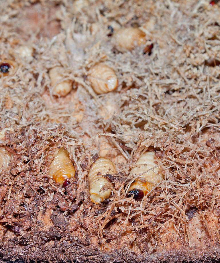 Le femmine depongono le uova singolarmente nei tessuti molli, principalmente alla base delle fronde viventi. Le larve si nutrono dei tessuti più soffici e umidi (aree di crescita) che presentano una percentuale di fibre da bassa a moderata. La loro alimentazione causa il deterioramento di questo tessuto facilitando così la deposizione di nuove uova più in profondità . Inoltre, ciò fornisce punti di ingresso ad agenti microbici che possono distruggere ulteriormente il tessuto vivente. A causa della morfologia specifica delle palme, la distruzione diretta o indiretta del bocciolo apicale porterà alla morte della pianta. Ciò fa del punteruolo rosso (Rhynchophorus ferrugineus) un insetto altamente dannoso.