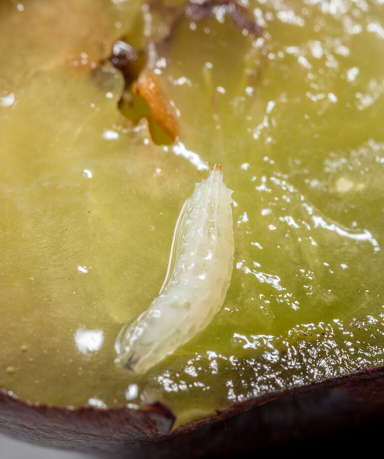 Dopo l'ovideposizione, i piccoli tubi di respirazione sporgono dal frutto ma sono difficili da vedere. L'alimentazione delle larve nel frutto ne determina il cedimento dei tessuti. Anche in assenza di cedimento, la presenza di larve all'interno dei frutti li rende non commercializzabili. I forellini prodotti dall'ovideposizione da parte di D. suzukii espongono i frutti a patogeni (come batteri, funghi e lieviti). Infine, il deterioramento dei frutti può aumentarne la sensibilità ad attacchi di altre specie di Drosophila. D. suzukii ha una vasta gamma di ospiti, tra cui i piccoli frutti (ad esempio lamponi, more, mirtilli, fragole) e le drupacee (ad esempio ciliegie e prugne) che sono particolarmente sensibili alle infestazioni.